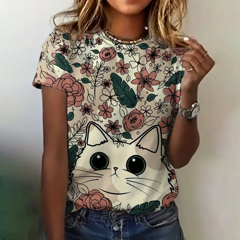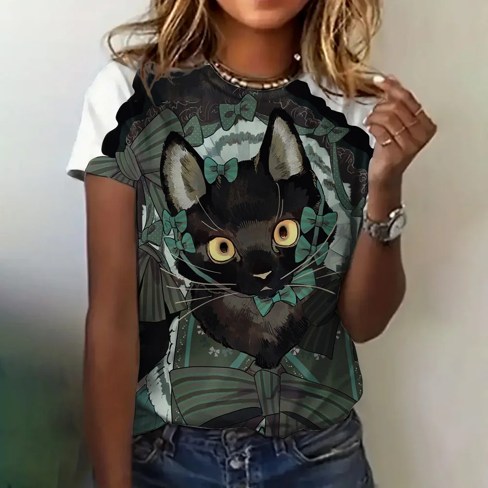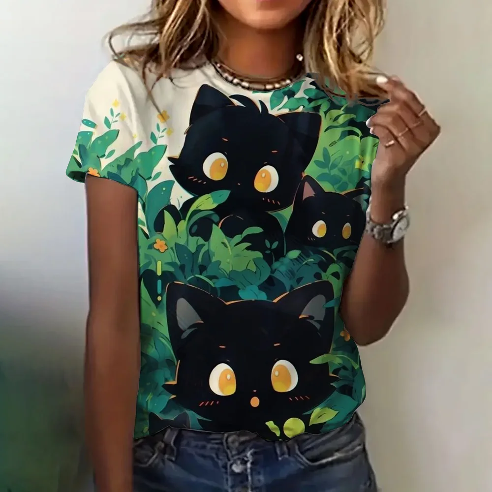 Women’s Clothing T-shirt Cat Anime Print Crewneck Short Sleeve Summer Loose Casual Top Dating Elegant Clothing Women’s T-shirt
